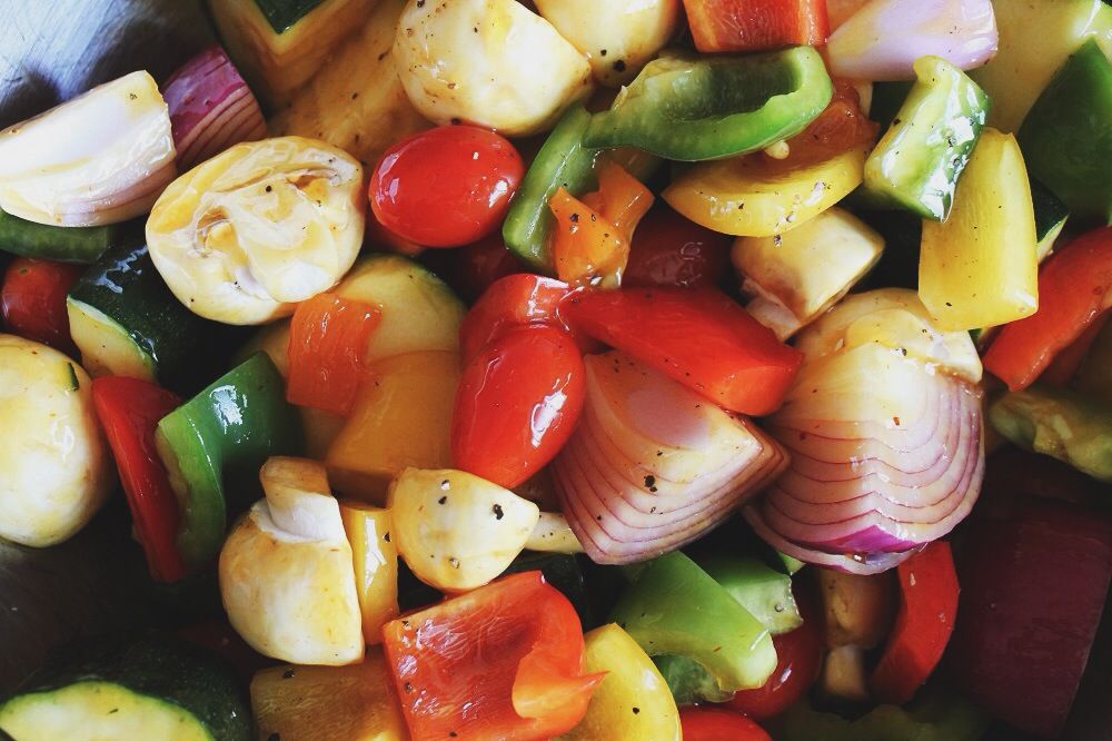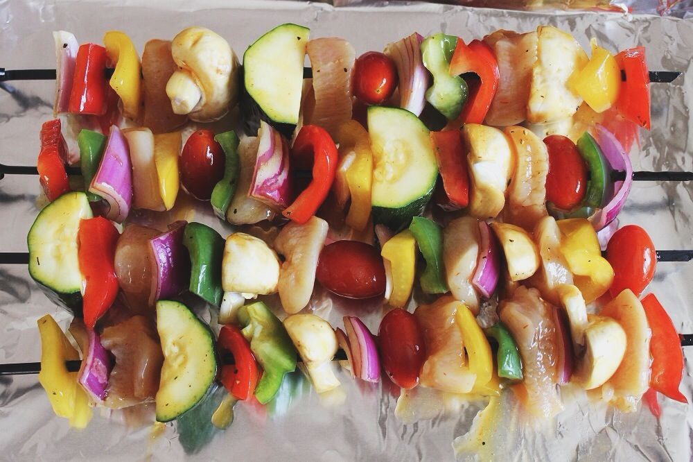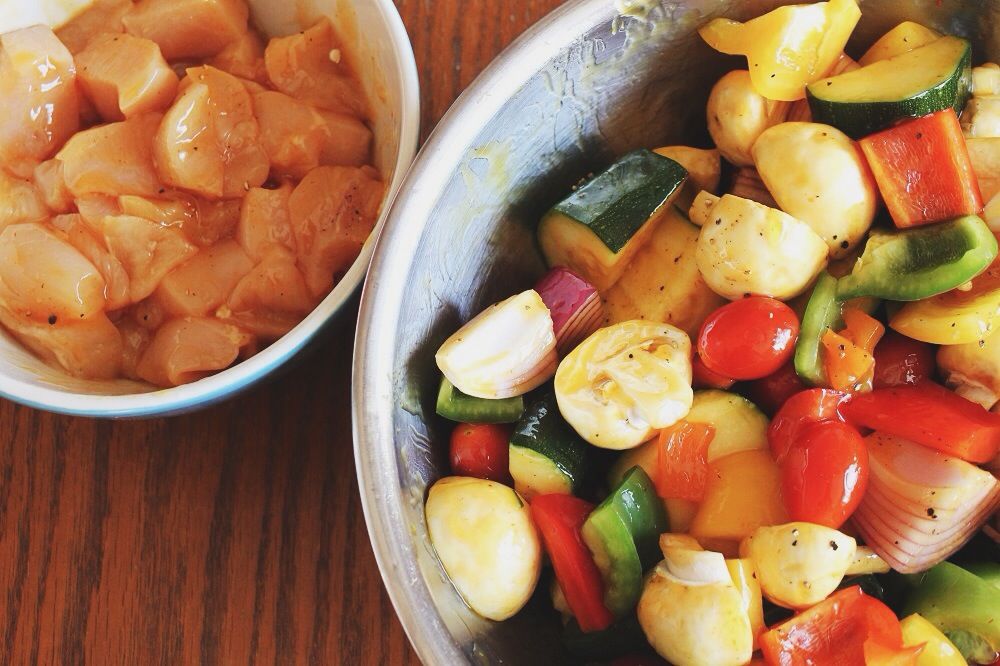 Clean and chop your chicken into large cubes and set aside. Wash your hands before you work with your veggies. Clean your veggies, there's no need to peel your zucchini, unless you prefer it that way. Chop everything into large chunks, accept for your tomatoes and pineapple. For the red onion I usually cut into 8 large pieces and just seperate the layers, leaving 2-3 pieces together for each "piece" of onion. Tip: If you want less skewers, just use your best judgement and only cube the amount of veggies that you need. Cut this recipe in half and it will make 6 good skewers.