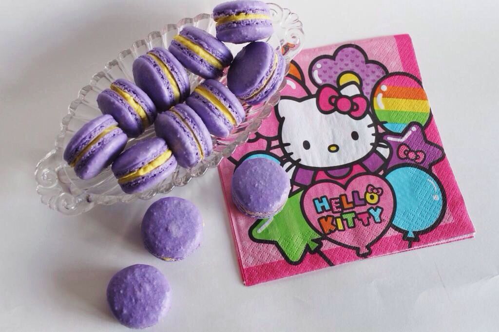 As I said yesterday, we celebrated early for Josie's 2nd birthday. Of course, it was a prime opportunity to practice my french macaron making skills. Because I was also making red velvet cupcakes I decided to keep it easy and stick with the same icing I was using for the cake - cream cheese. Who doesn't love cream cheese icing though, for real. Turns out it actually goes really well with vanilla bean macaron shells. I tinted the shells purple and the icing a light yellow, to match some of the colours we had in the Hello Kitty theme for Josie's party. It made me really want to make the macarons lemon, but, that's for another time.